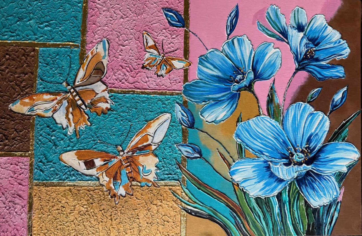 Floral Butterfly painting, Gold foil, Mixed Media on Canvas,36*24