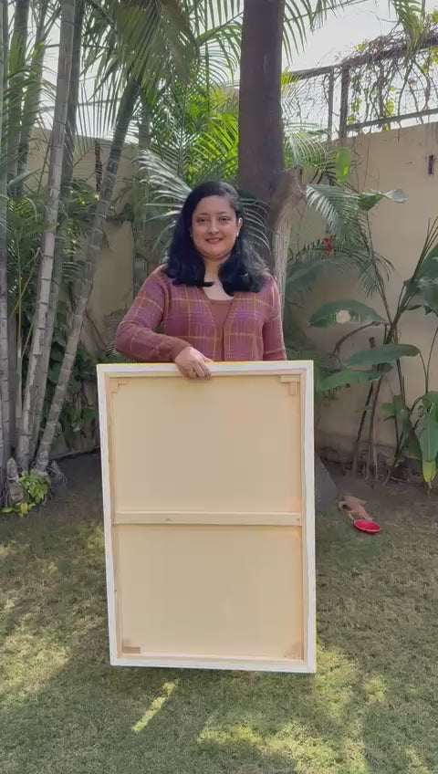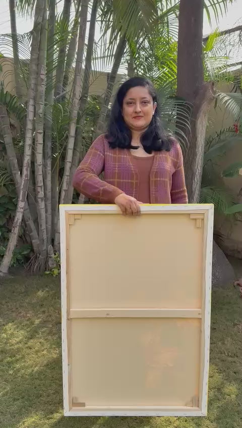 The canvas is stretched so it can be put directly on the wall .No framing required. The painting will be securely dispatched in a custom made wooden case as shown in the photographs and will be wrapped with utmost care in bubble sheets for long distance travel.